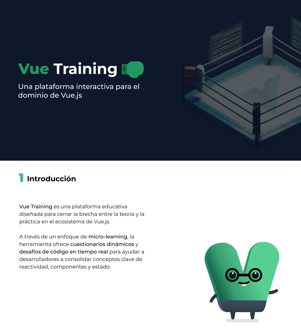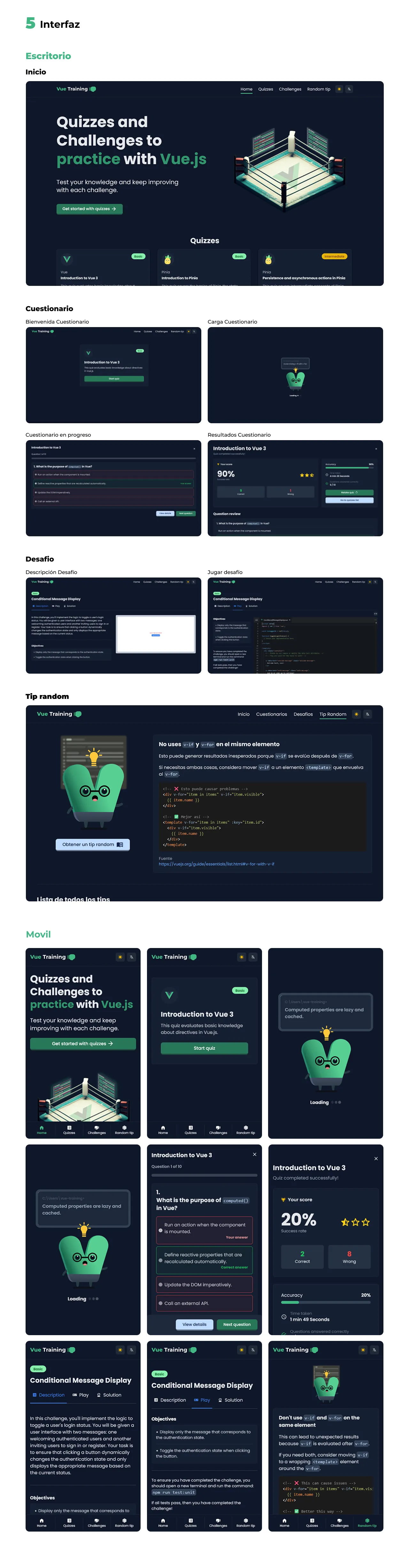 Vue Training is a platform designed to test both practical and theoretical knowledge of Vue. It features quizzes and challenges aimed at reinforcing learning in a dynamic way.